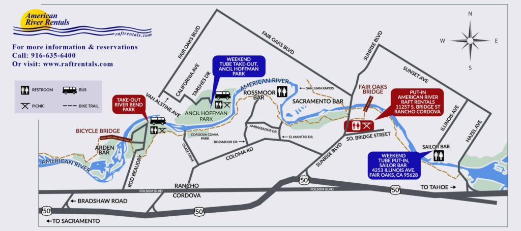 From the San Francisco Bay Area, take Interstate 80 East to Sacramento. This will turn into Highway 50 towards South Lake Tahoe. Continue on Highway 50 approximately 20 miles. The next exit is Sunrise Blvd. Take this exit north, head left on the off-ramp. Travel about 1.5 miles north on Sunrise and turn right on So. Bridge street just before Sunrise crosses the American River. The raft rental is visible from Sunrise.